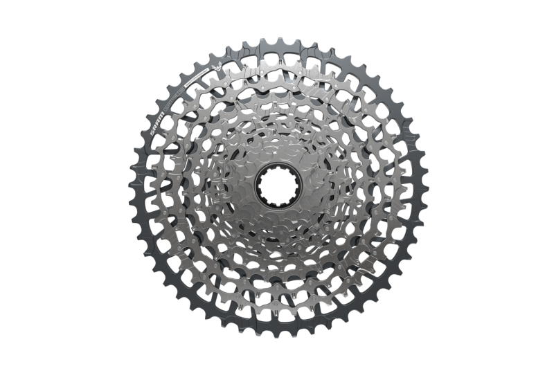 Para su construcción, Sram ha unido los 8 piñones más grandes mediante el clásico sistema de pines ya utilizado en otros modelos, mientras que para las 4 coronas más pequeñas ha utilizado un sistema nuevo, un bloque de acero, esto significa que en el conjunto general se va a ver reflejado en un ligero incremento del peso pero a costa de conseguir una mayor durabilidad y solidez del conjunto, ya que estas últimas coronas de acero cuentan con un revestimiento de níquel que lo hace más silencioso y más resistente al desgaste, Esta tecnología la han denominado MINI CLUSTER, la cual combina los cuatro pequeños engranajes mecanizados por CNC a partir de un solo bloque de acero con ocho engranajes adicionales que están unidos individualmente, como detalle hay que resaltar la marca roja en el 5º piñón para ser usada en el proceso de instalación del grupo y facilitar la tarea, siendo solo la corona más grande de aluminio