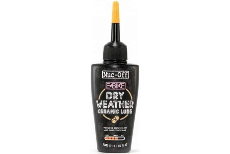 Opinión del experto. El lubricante Muc-Off e-Bike clima seco ha sido diseñado para los ciclistas que se enfrentan a los terrenos secos y polvorientos. Su fórmula cerámica con nitruro de boro reduce la fricción al mínimo, protege tu transmisión y mantiene tu e-bike lista para largas aventuras sin atraer polvo ni desgaste.