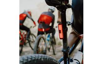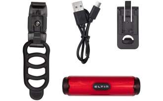 El faro trasero recargable Eltin de 50 lúmenes incluye dos soportes universales que se ajustan a las preferencias del usuario. Un soporte con banda de goma que se adapta a varias posiciones para colocarlo en los raíles del sillín o en el caso y otro soporte rígido para colocarlo en la ropa. Cuenta con tres modos y duraciones de luz