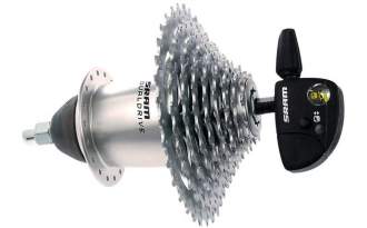 DualDrive de SRAM es un tren de transmisión único que combina un cubo de engranaje interno de tres velocidades con un cassette externo y un cambio. El resultado es una amplia gama de engranajes en un sistema de control limpio y con una sola mano. La palanca de cambios DualDrive presenta un movimiento de cambio de agarre para el cambio trasero y un gatillo que controla los cambios de marcha en el buje interno.