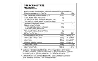 Aporta los 5 electrolitos sodio, cloruro, potasio, calcio y magnesio. Contiene además, cafeína 75mg por ración y te ayuda a la concentración durante el entrenamiento.