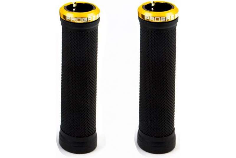 Puños Progress PG-303 manillar fabricados en goma muy resistente con cierres en aluminio de color oro y tornillo para su fijación.