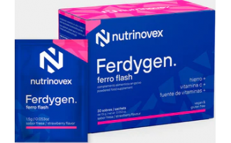 Ferdygen Ferro Flash es un suplemento de Nutrinovex alimenticio en polvo bucodispersable, formulado con pirofosfato de hierro y vitaminas, que contiene azúcar y edulcorantes.