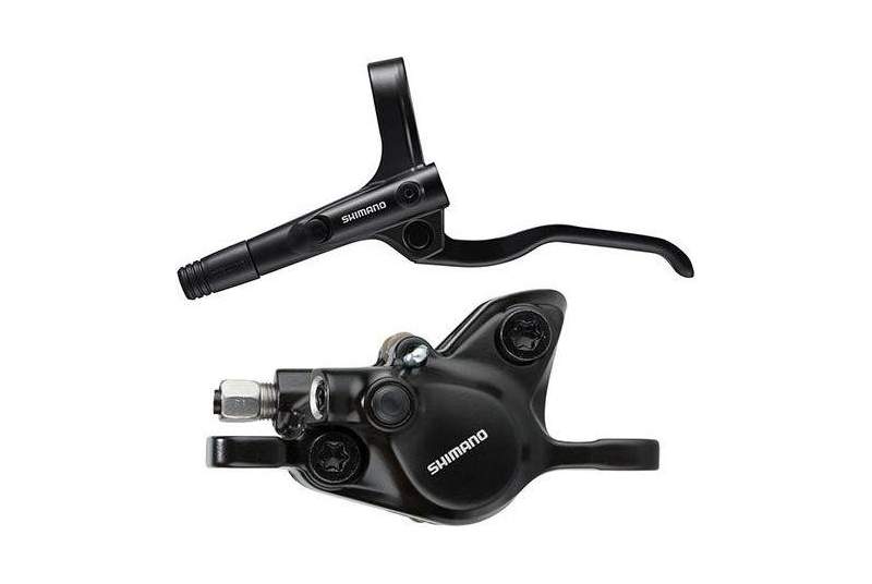 Los frenos delantero y trasero Shimano MT200 hidráulico post mount resina incluyen la pinza de freno y la maneta. Ambos purgados, listos para usarse.