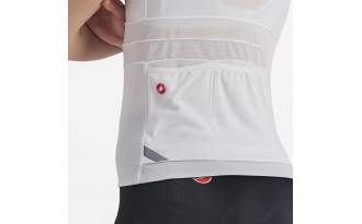 Por otro lado, integra una banda elástica con silicona con los bolsillos traseros llenos de accesorios o geles, eliminando cualquier distracción y garantizando comodidad constante. La cremallera YKK® Vislon® con solapa y tirador personalizado de Castelli permite ventilar fácilmente el maillot y ajustar la temperatura sin interrumpir la marcha.